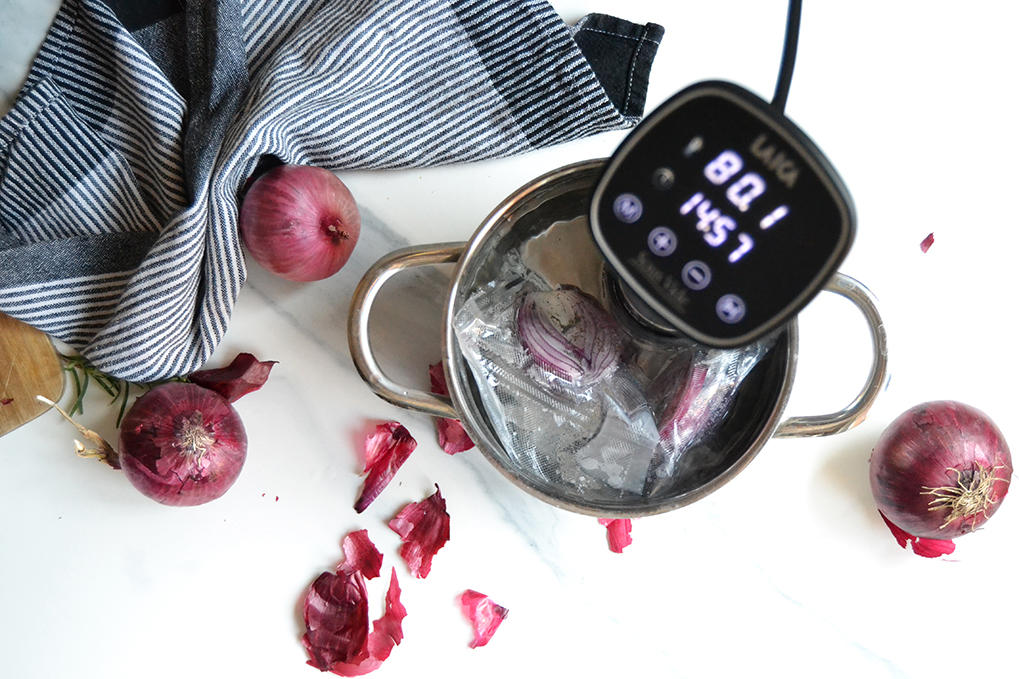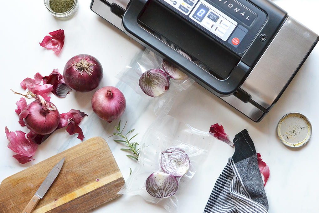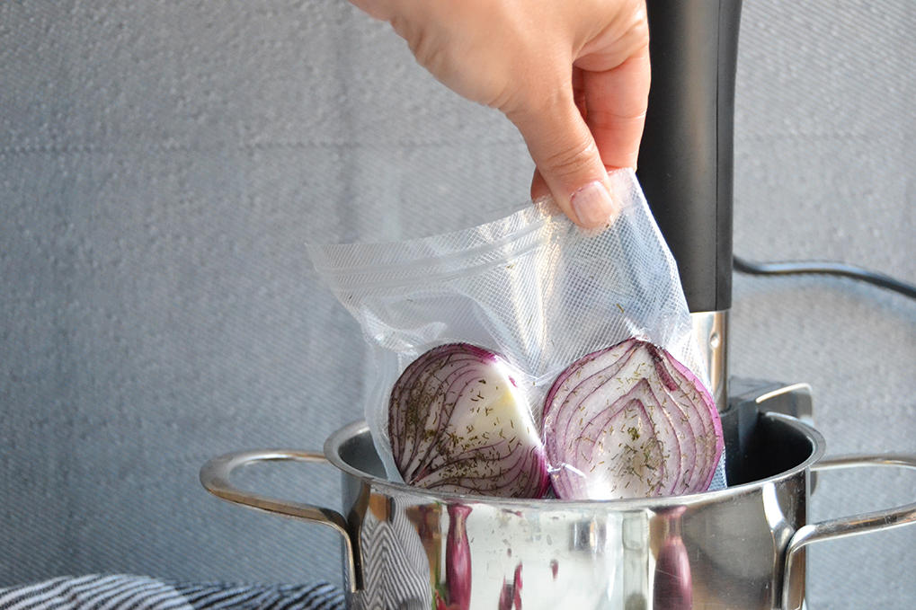 Coloque las cebollas peladas en dos bolsas de vacío y córtelas por la mitad, junto con una pizca de eneldo seco.