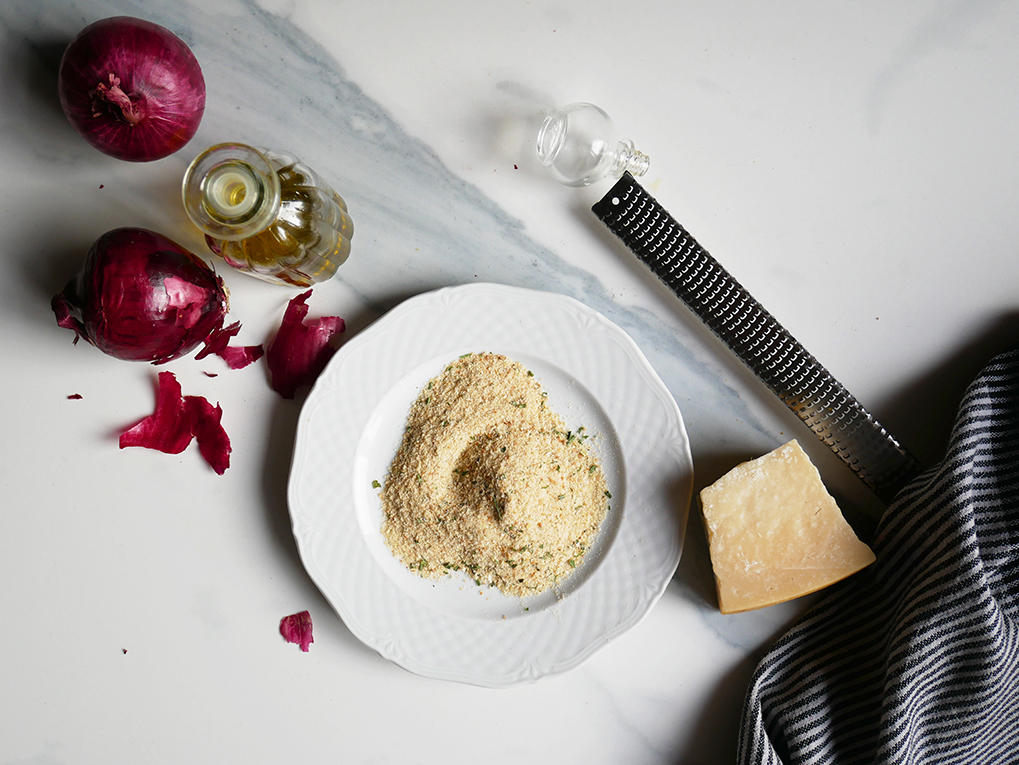 Coloque las cebollas en una placa forrada con papel de hornear y sazone con aceite, sal y pimienta. Cubra con las migas de pan, un chorrito de aceite de oliva y hornee a 200 grados durante 7 minutos en un horno de convección.